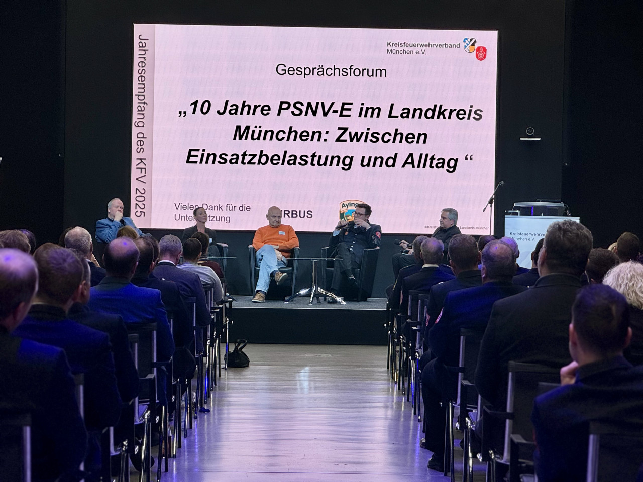 „10 Jahre PSNV-E – zwischen Einsatzbelastung und Alltag“. Diskutiert wurden die bestmögliche Unterstützung unserer Einsatzkräfte bei der Prävention psychischer Belastungen sowie die Bedeutung einer starken kommunalen Zusammenarbeit. Als Podiumsgäste konnten wir unseren Fachberater PSNV-Feuerwehr Benedikt Knoche, Landrat Christoph Göbel, die Traumatherapeutin Alexandra Winkel sowie Reinhold Zitzelsperger, Gründungsmitglied des Nachsorgeteams der Berufsfeuerwehr München, begrüßen.